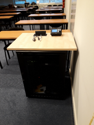 As with all University based systems the control of the beamer is done through a little console on top of a small 19-inch cabinet housing some electronic equipment. On top of the cabinet we have a small desktop placed on which you can put your laptop (there is no fixed desktop computer available in this setup).