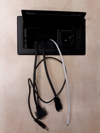 There are three different connection cables to connect your laptop to the system: VGA, HDMI and USB-C. So there is no need for converter cables for the standard connector types. The desktop also offers one power socket to keep your laptop running throughout your presentation.