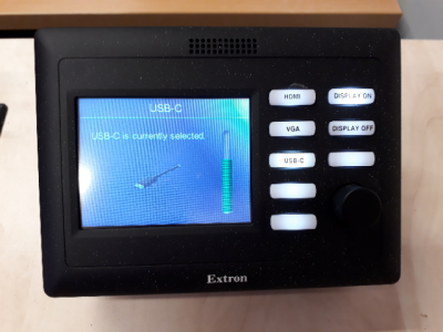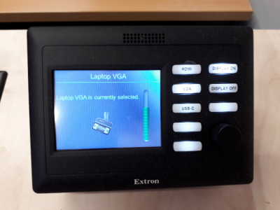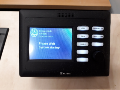 and the Extron system will lower the projection screen, start the beamer and both TV half way the room. Once the system is active, choose from the console one of the buttons 'VGA', 'HDMI', 'USB-C' to take the information presented on that particular cable to the beamer/TV's.