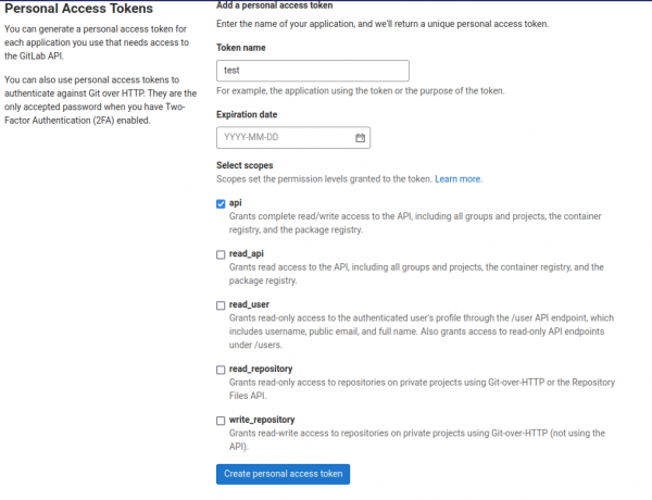 Visit https://gitlab.lorentz.leidenuniv.nl/-/profile/personal_access_tokens, choose a token name, assign the necessary scopes4), and click on Create Personal Access Token.