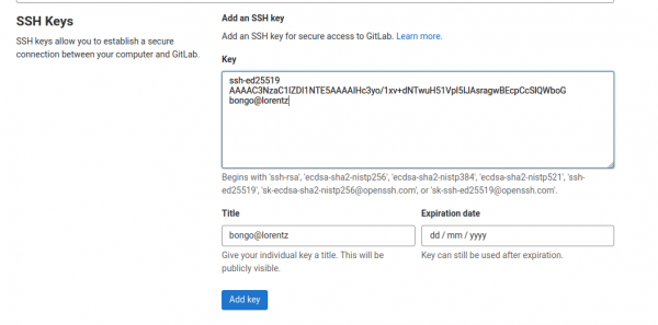Visit https://gitlab.lorentz.leidenuniv.nl/-/profile/keys, copy the contents of the newly created $HOME/.ssh/id_ed25519.pub and paste it in the Key area like in the figure below. Click on Add key.