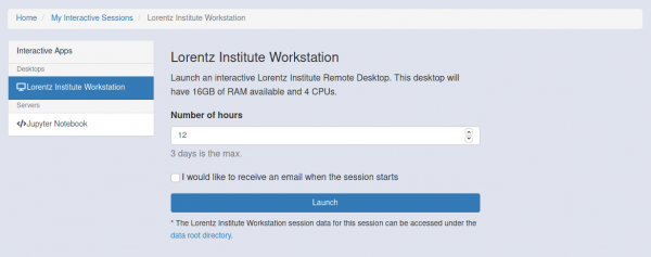 Access Interactive Apps via the toolbar Interactive Apps menu or via the Quick links buttons in the Dashboard. Choiches are - Lorentz Institute Workstation - Jupyter Notebook Workstations are preconfigured with several softwares | ![]() |