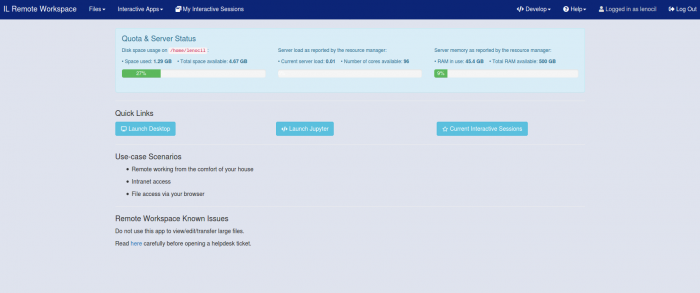 ![]() | Start/monitor/manage your remote sessions via the Dashboard View/edit/create/transfer files The system GUI cannot handle large files (max 1GB is advised) |