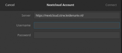 Use https://nextcloud.strw.leidenuniv.nl/ for the Server field. For the Username and Password fields use your Sterrewacht credentials.
