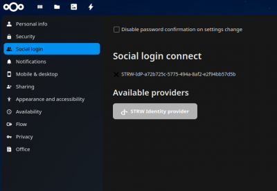 So, the correct way for existing users, is to login as usual without 2FA, and then go to your own profile menu, and open the settings page. In the “Social login” entry, the user can see the “STRW Identity provider” under “Available providers”. Clicking that button will bring them to the keycloak login page, and once authenticated there, the existing account in nextcloud is connected to the strw account in keycloak. When the user already happens to be logged in through keycloak, they will immediately see the identity provider button here. From then on, the user can use the “STRW Identity provider” button on the nextcloud login page to log in through keycloak (or be logged in immediately if already logged in to another keycloak-enabled site)