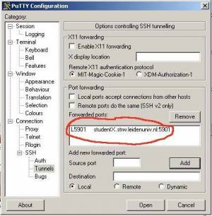 3. Click the “Add” button, and you should see the new tunnel “L5901 hostname.strw.leidenuniv.nl:5901” in the “Forwarded Ports:” box.