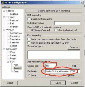 2. Now, so far all we've done is created a session that we could use to log in and use the shell prompt. Next we need to tell PuTTY how we want to tunnel. On the left, under “Category”, you'll see “Tunnels” as the second from the bottom. Click on it. Then, on the right at the bottom, you'll see the “Source Port” text box. Here you will input the port that you wish to tunnel. Normally you are using display number :0 on you local machine, but we are going to use another display number as :0 is usually not available for tunneling. Most of the time you are using display number :1, so you put in the number 5901 (other display numbers :N correspond to porrt number 590N). Finally, in the “Destination” text box below that, you'll put where that port should be forwarded. Since the “Destination” box is from the point of view of the computer you're connecting to, you have to put can put there any inside machine that has X11 access, then a colon “:”, then the port, i.e. “hostname.strw.leidenuniv.nl:5901” without the quotes.