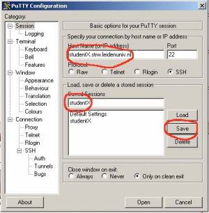 1. Setup PuTTY: First, start up the program. When PuTTY first starts up, you see the sessions screen; you need to type in the information for the computer with which you wish to connect. Notice that I have typed in the hostname in the Host Name field, that I've selected the SSH protocol radio button, and that I've given the session a name that I will be saving to. However, don't save the session yet.