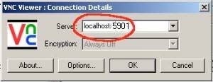 6. Then, bring up your VNC viewer and, for the VNC server that you want to connect to, type “localhost:port”, where “port” is the port you're forwarding. In this case, it's “localhost:5901”. It will ask you for the password you have given in section 5. while starting the vncserver.