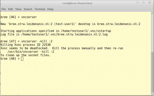 Nou you are still left wit the open putty ssh session and its tunnel. But on the hostname the vncserver is still running, so we need to close that too. Type on the unix prompt : vncserver -kill :1 or whatever port number you have been assigned previously. This will end the vncserver session and now you are ready to logout the putty session by typing on the unix command: exit.