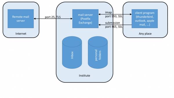 There are two storage elements to the mail system: Inbox and personal folders. The Inbox is physically located at the mail server to which no user has login rights. Inbox content can only be accessed after successful authentication. The personal mail folder structure resides inside the user home directory space. Both are accessed using the dovecot or MS Exchange utility (based on imaps encrypted and authenticated protocol).