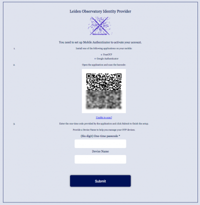 Since you are now setting up 2FA for the first time, you may also type in a name for the device from which you are getting the passcodes. It is merely a tag for later use. Having filled in all required fields, you continue to Submit the next form.