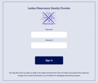 After you have installed one of the two APPs you are ready to proceed. You now have to go to a web page that helps you setup 2FA. For example, you can go to the Sterrewacht virtual desktop. When you access that page you are redirected to the Observatory Identity Provider and presented with a login window.