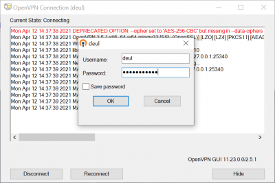 When you are done using the VPN connecntion, right click the OpenVPN icon and select the line Disconnect from the popup menu.