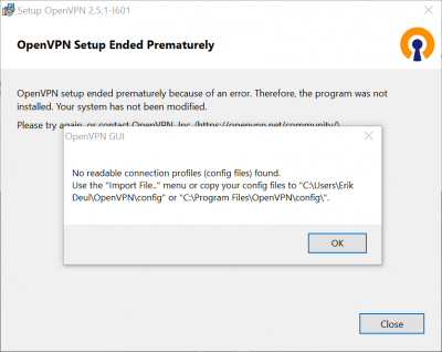 Then closing, OpenVPN will complain it has no configuration file: